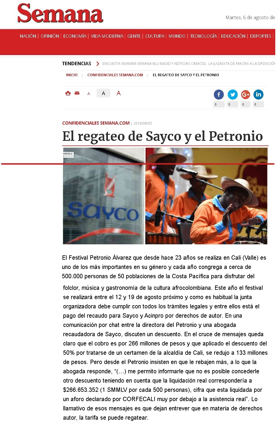 Este año el festival se realizará entre el 12 y 19 de agosto próximo y como es habitual la junta organizadora debe cumplir con todos los trámites legales y entre ellos está el pago del recaudo para Sayco y Acinpro por derechos de autor. En una comunicación por chat entre la directora del Petronio y una abogada recaudadora de Sayco, discuten un descuento