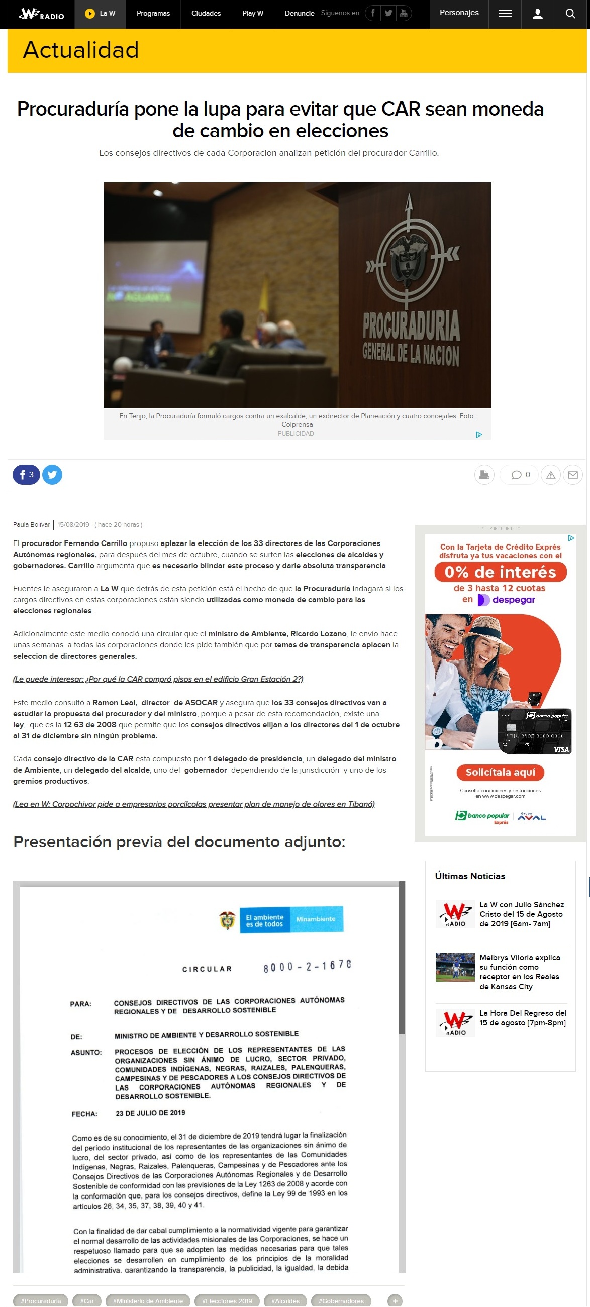 El Procurador General de la Nación, Fernando Carrillo, propuso aplazar la elección de los 33 directores de las Corporaciones Autónomas Regionales, para después del mes de octubre, cuando se surten las elecciones de alcaldes y gobernadores. Carrillo argumenta que es necesario blindar este proceso y darle absoluta transparencia.