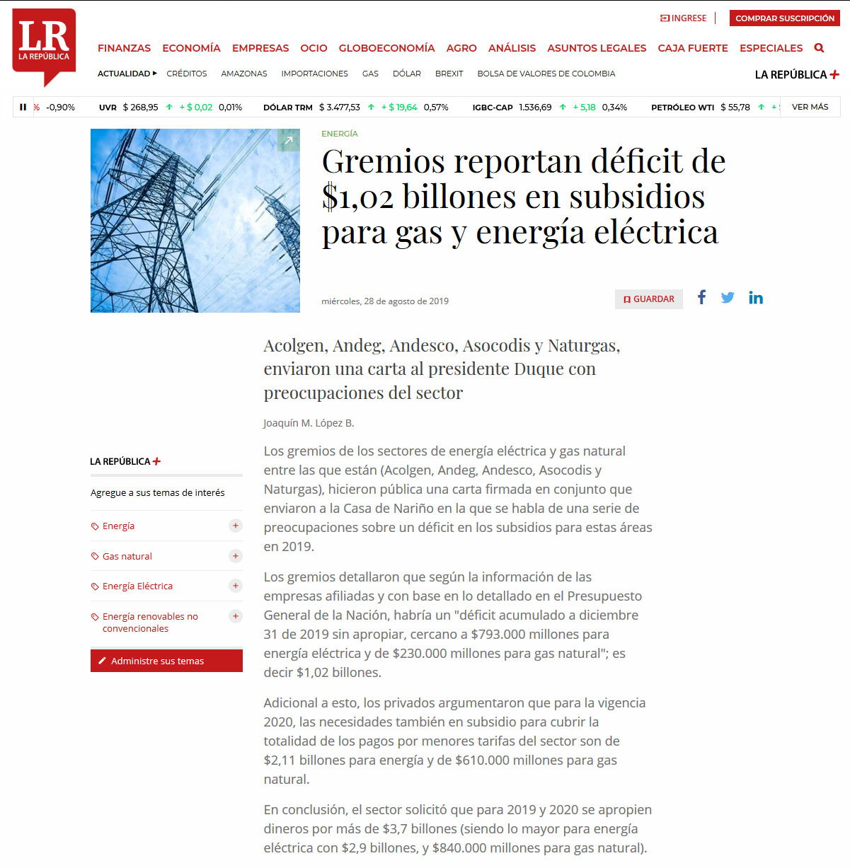 Los gremios de los sectores de energía eléctrica y gas natural entre las que están (Acolgen, Andeg, Andesco, Asocodis y Naturgas), hicieron pública una carta firmada en conjunto que enviaron a la Casa de Nariño en la que se habla de una serie de preocupaciones sobre un déficit en los subsidios para estas áreas en 2019.