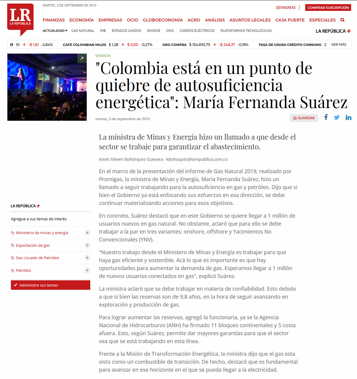 En el marco de la presentación del informe de Gas Natural 2019, realizado por Promigas, la ministra de Minas y Energía, María Fernanda Suárez, hizo un llamado a seguir trabajando para la autosuficiencia en gas y petróleo. Dijo que si bien el Gobierno ya está enfocando sus esfuerzos en esa dirección, se debe continuar materializando acciones para esos objetivos.