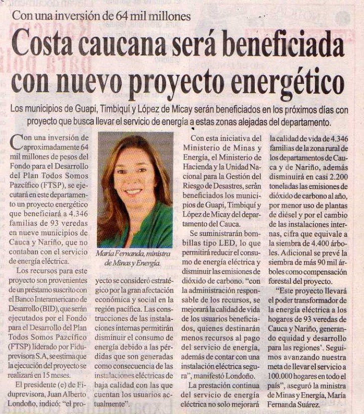 La Fiduprevisora administrará los recursos del Fondo para el Desarrollo del Plan Todos Somos Pazcífico, que beneficiará a 4.346 familias de 93 veredas de municipios del Cauca y Nariño que no contaban con el servicio de energía. El proyecto será ejecutado por Cedenar.